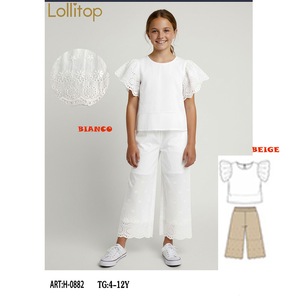 Completo estate bambina composto da t-shirt m/m e pantalone cropped in pizzo di cotone Lollitop Tg. 4/12 Assortimento per Tg. e colore min. 5 pz. Tg. 4-6-8-10-12