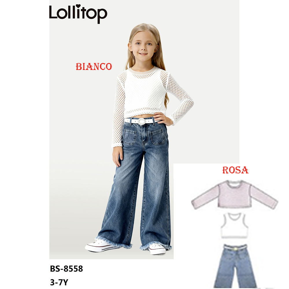 Completo bambina primavera composto da maglia traforata, canotta e jeans in cotone Lollitop Tg. 3/7. Assortimento per Tg. e colore min. 5 pz. Tg. 3-4-5-6-7