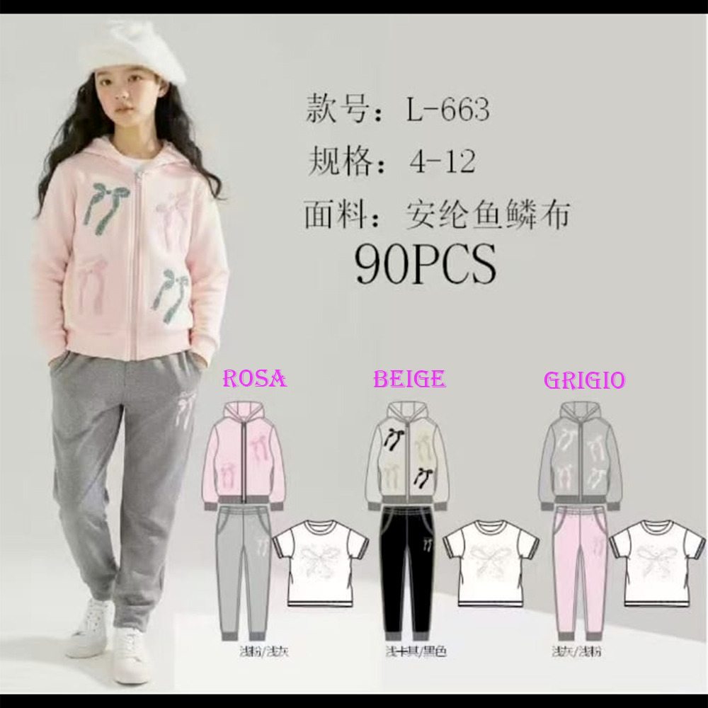 Completo bambina primavera composto da felpina con zip e cappuccio, t-shirt m/m e pantalone in cotone (65% cot - 35% pol) Mouset Tg. 4/12. Assortimento per Tg. e colore min. 5 pz. Tg. 4-6-8-10-12