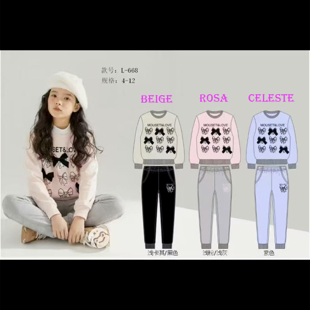 Completo bambina primavera composto da felpina e pantalone in cotone (65% cot - 30% pol - 5% el) Mouset Tg. 4/12. Assortimento per Tg. e colore min. 5 pz. Tg. 4-6-8-10-12
