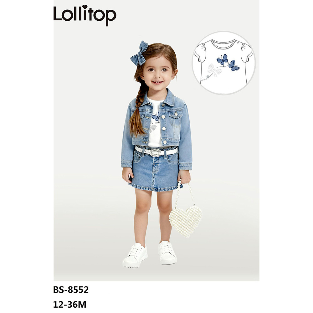 Completo neonata primavera con t-shirt m/m, giacca e gonna in jeans Lollitop Tg. 12/36. Assortimento per Tg. e colore min. 5 pz. Tg. 12-18-24-30-36