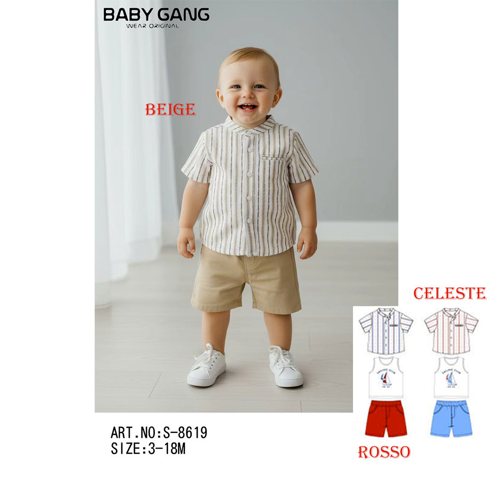 Completo neonato estate composto da camicia alla koreana m/m, canotta e bermuda in cotone Baby Gang Tg. 3/18 mesi Assortimento per Tg. e colore min. 4 pz. Tg. 3/6-6/9-9/12-12/18