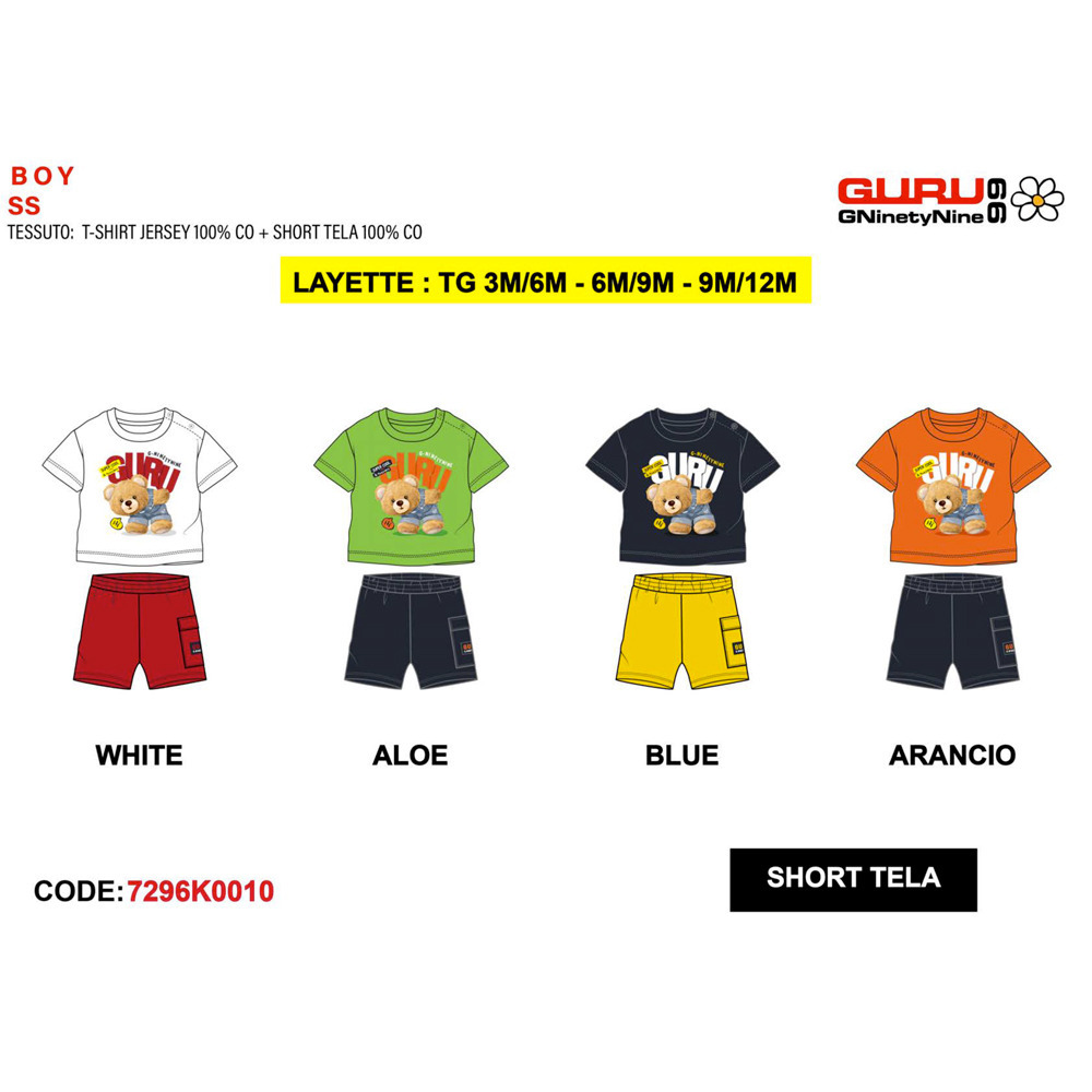 Completo neonato estivo con t-shirt e bermuda in cotone Guru Tg. 3/12 mesi Assortimento per Tg. e colore min. 3 pz. Tg. 3/6-6/9-9/12