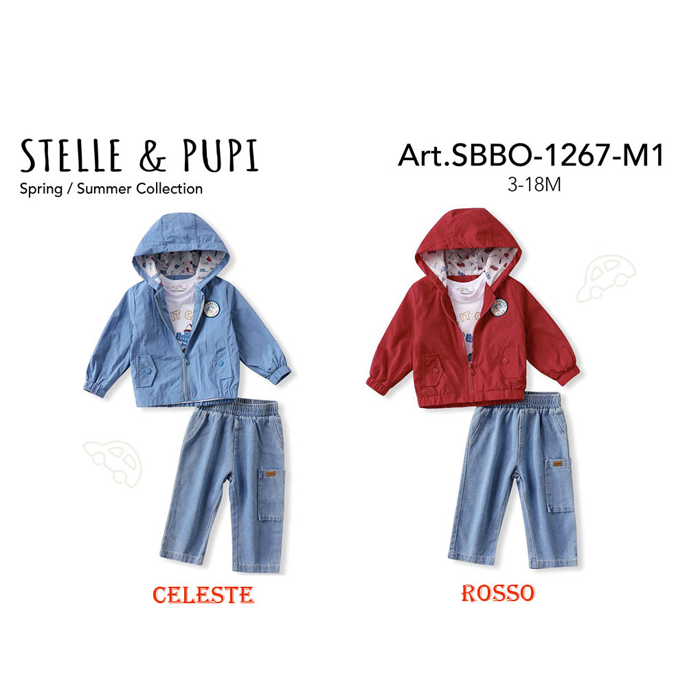 Completo neonato primavera composto da giubbino con cappuccio, t-shirt e jeans Stelle & Pupi Tg. 3/18 Assortimento per Tg. e colore min. 4 pz. Tg. 3/6-6/9-9/12-12/18