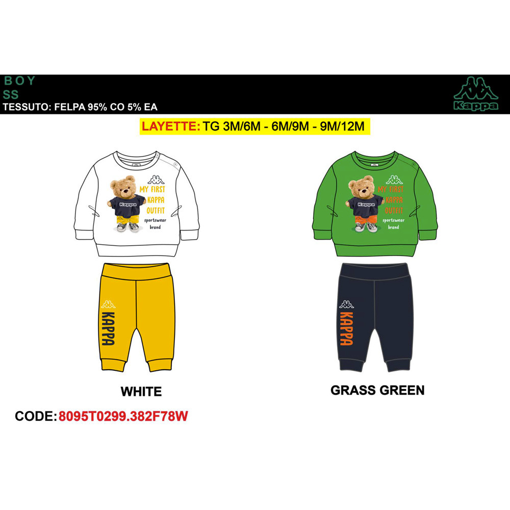 Tuta neonato primavera composta da felpina a paricollo, pantalone in cotone Kappa Tg. 3/6-9/12 Assortimento per Tg. e colore min. 3 pz. Tg. 3/6-6/9-9/12