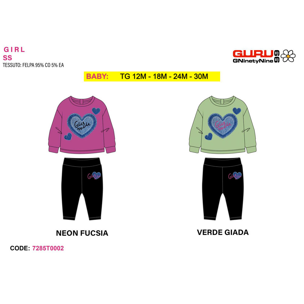 Tuta primavera neonata composta da felpina a paricollo, pantalone in cotone Guru Tg. 12/30 Assortimento per Tg. e colore min. 4 pz. Tg. 12-18-24-30