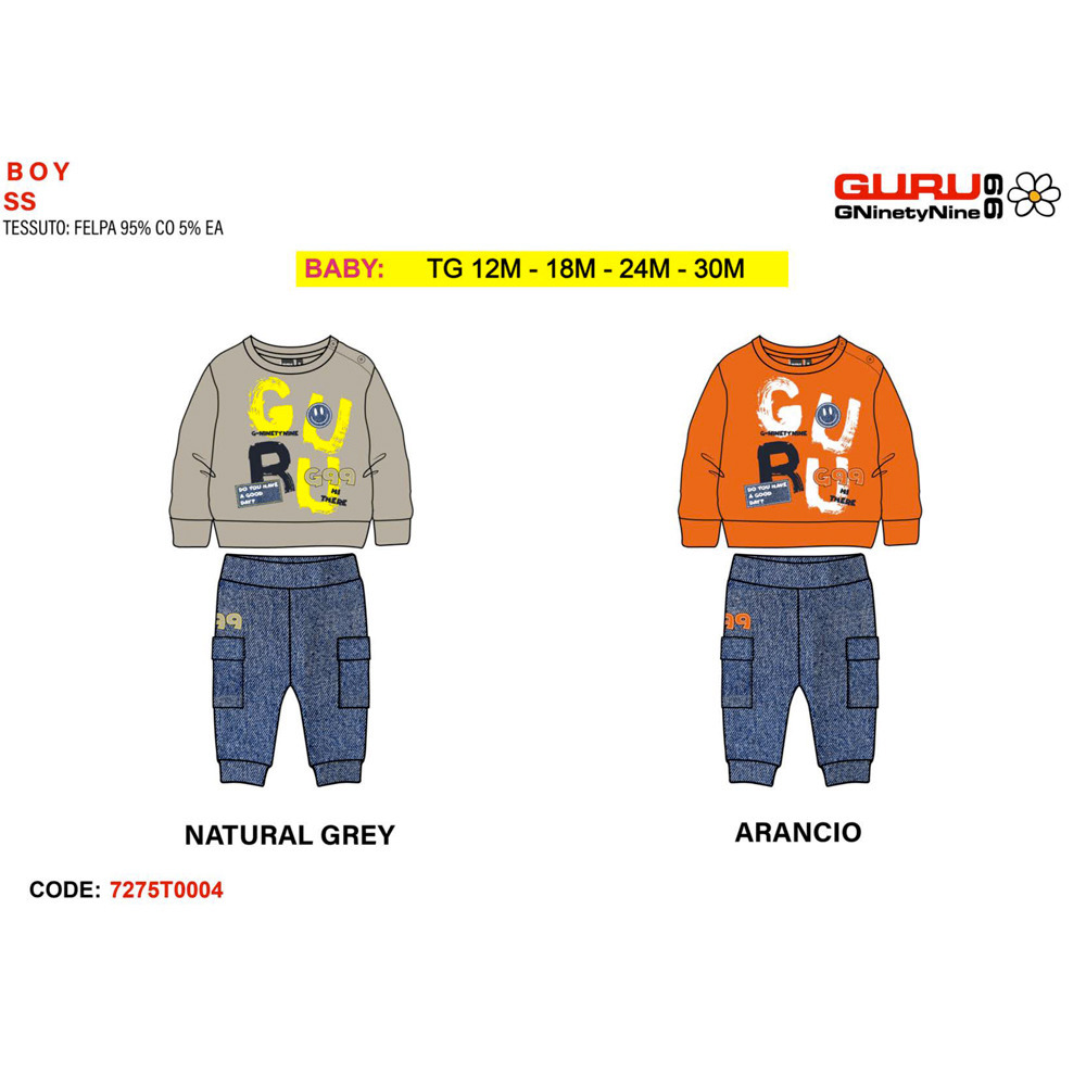 Tuta primavera neonato composta da felpina a paricollo, pantalone con tasconi effetto jeans Guru Tg. 12/30 Assortimento per Tg. e colore min. 4 pz. Tg. 12-18-24-30