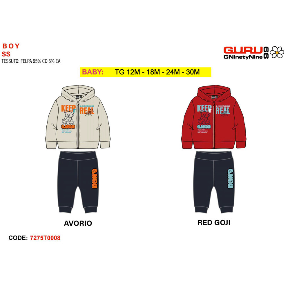 Tuta primavera neonato composta da felpina con zip e cappuccio, pantalone in cotone Guru Tg. 12/30 Assortimento per Tg. e colore min. 4 pz. Tg. 12-18-24-30