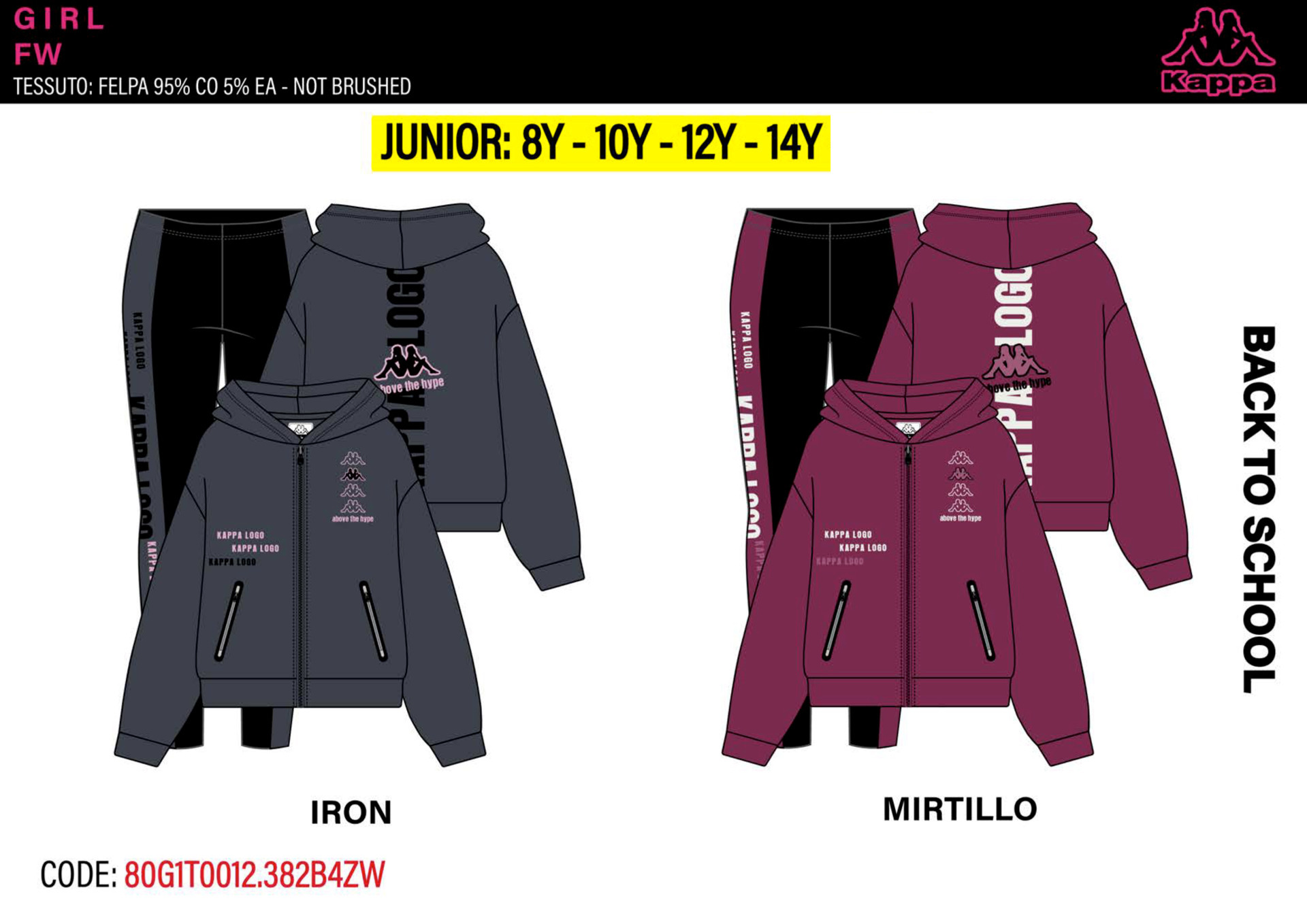 Tuta ragazza primavera composta da felpina con zip e cappuccio, pantalone in cotone Kappa Tg. 8/14 Assortimento per Tg. e colore min. 4 pz. Tg. 8-10-12-14