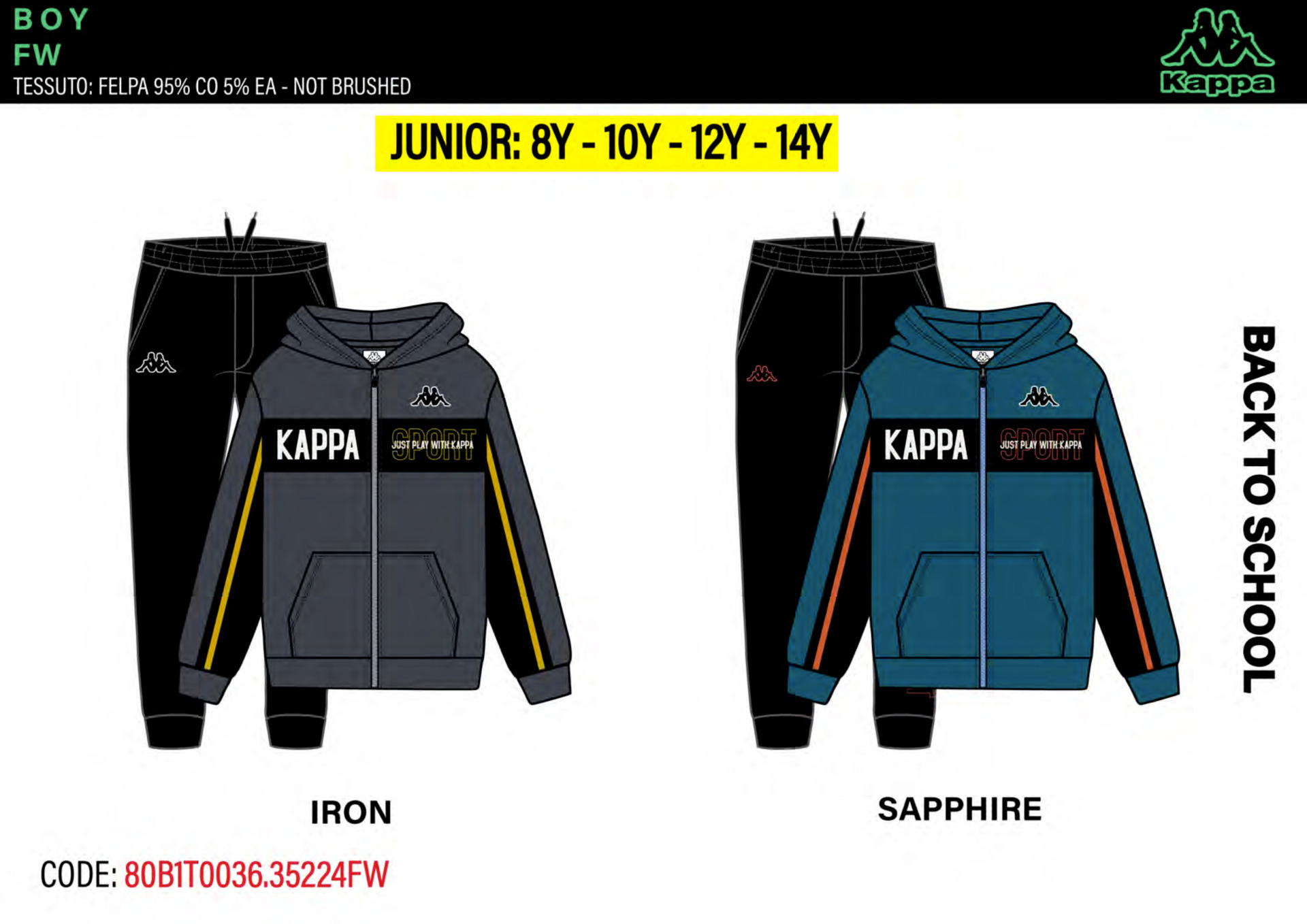 Tuta ragazzo primavera composta da felpina con zip e cappuccio, pantalone in cotone Kappa Tg. 8/14 Assortimento per Tg. e colore min. 4 pz. Tg. 8-10-12-14