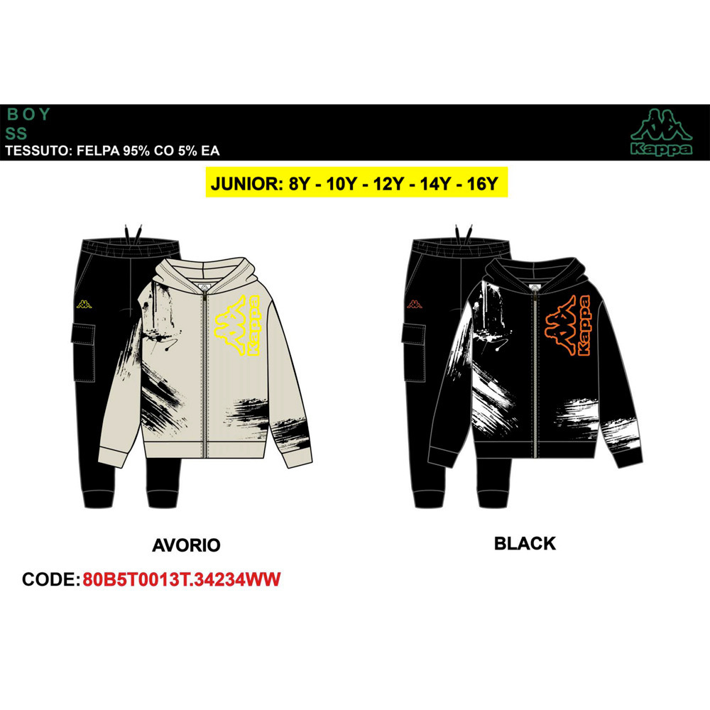 Tuta ragazzo primavera composta da felpina con zip e cappuccio, pantalone in cotone Kappa Tg. 8/16 Assortimento per Tg. e colore min. 5 pz. Tg. 8-10-12-14-16